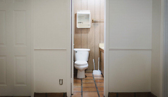 One of the first things we first noticed about the house was the lack of bathroom photos on the MLS listing. We knew that meant they must be pretty rough, and we were right about that. The powder room was quickly named "the haunted bathroom" with its weird wood paneling and sideways sink. The toilet seriously haunted us from across the kitchen and desperately needed a proper remodel.